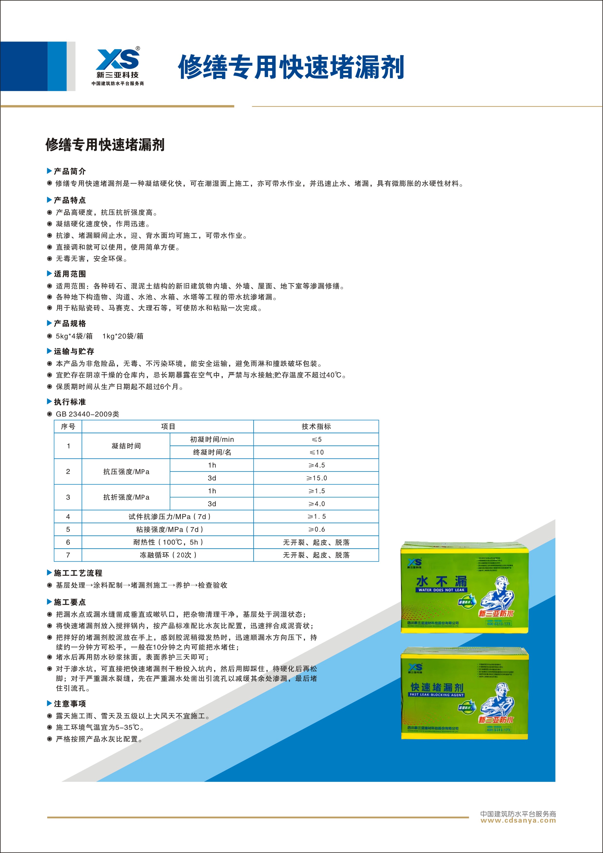 修繕專用快速堵漏劑是一種凝結硬化快,小時強度高,可在潮濕面上施工,亦可帶水作業(yè),并迅速止水、堵漏,具有微膨脹的水硬性材料。