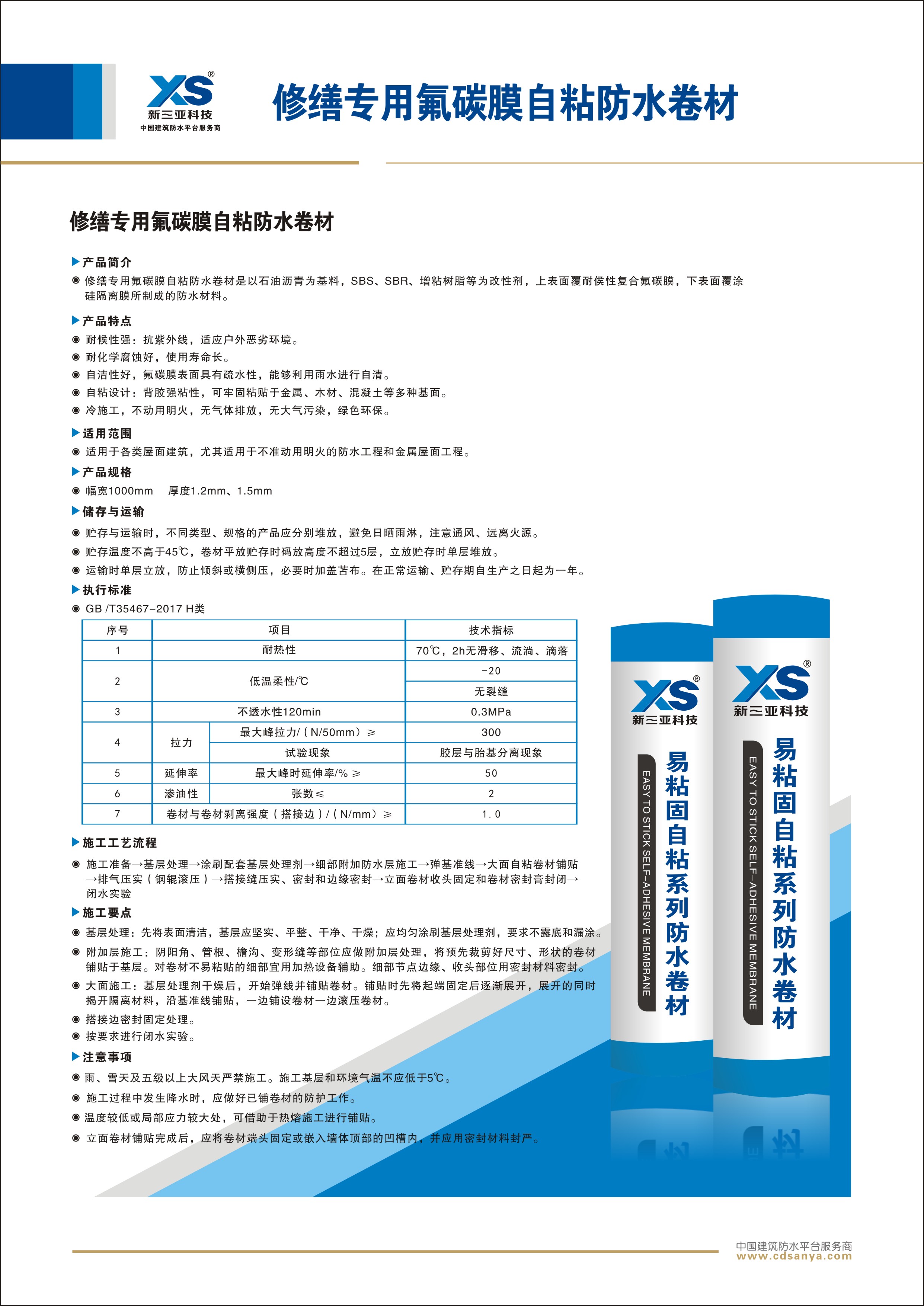 產(chǎn)品簡介: 以石油瀝青為基料,SBS、SBR、增粘樹脂等為改性劑,上表面覆耐侯性復合氟碳膜,下表面覆涂硅隔離膜所制成的防水材料。 規(guī)格:1.5 mm 厚度*寬度*長度 1.5mm 1m×20m 面膜顏色 白色 | ![]() |