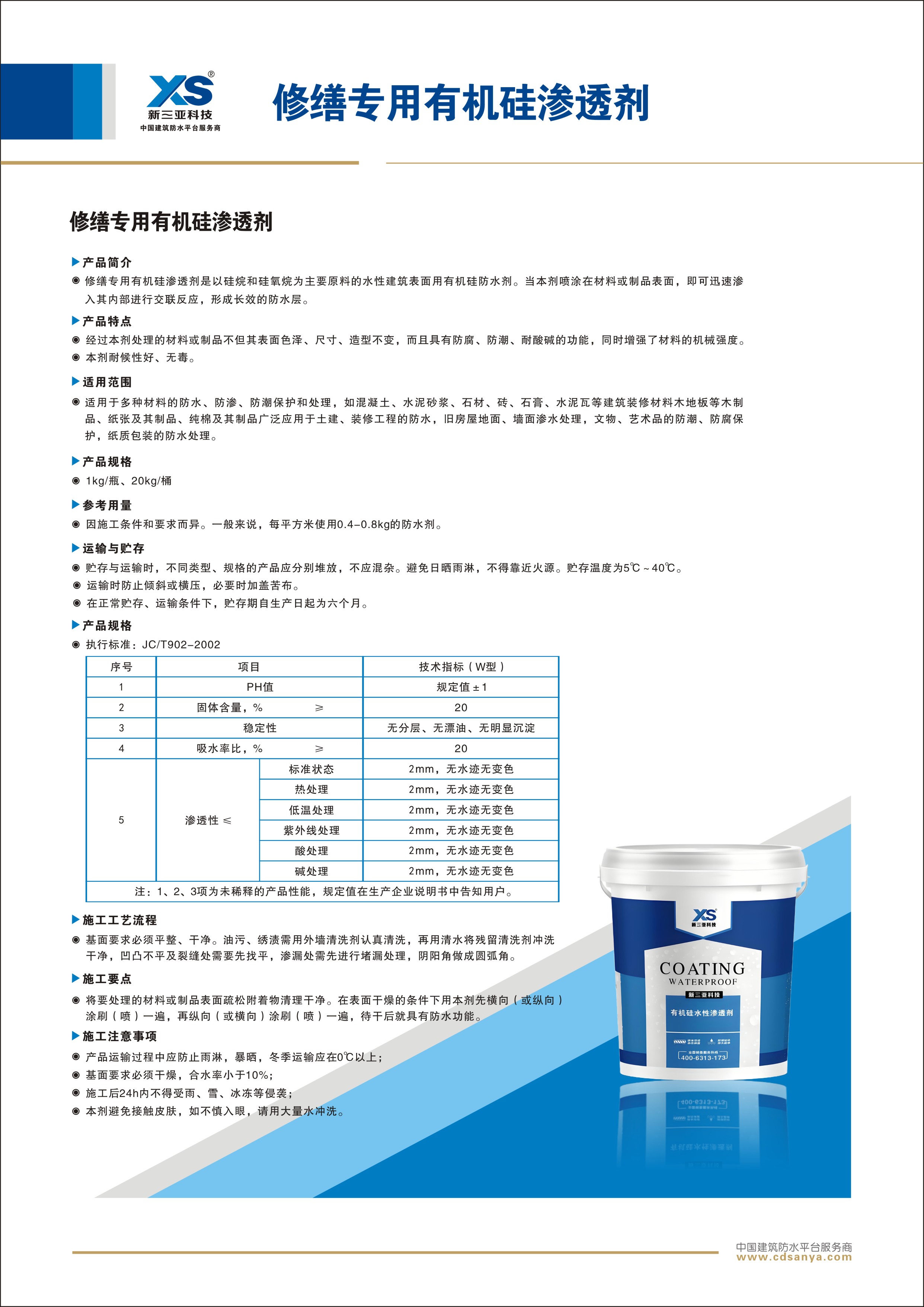 產(chǎn)品簡介: 修繕專用有機(jī)硅滲透劑是以硅烷和硅氧烷為主要原料的水性建筑表面用有機(jī)硅防水劑。當(dāng)本劑噴涂在材料或制品表面,即可迅速滲入其內(nèi)部進(jìn)行交聯(lián)反應(yīng),形成長效的防水層。 規(guī)格:5kg/桶